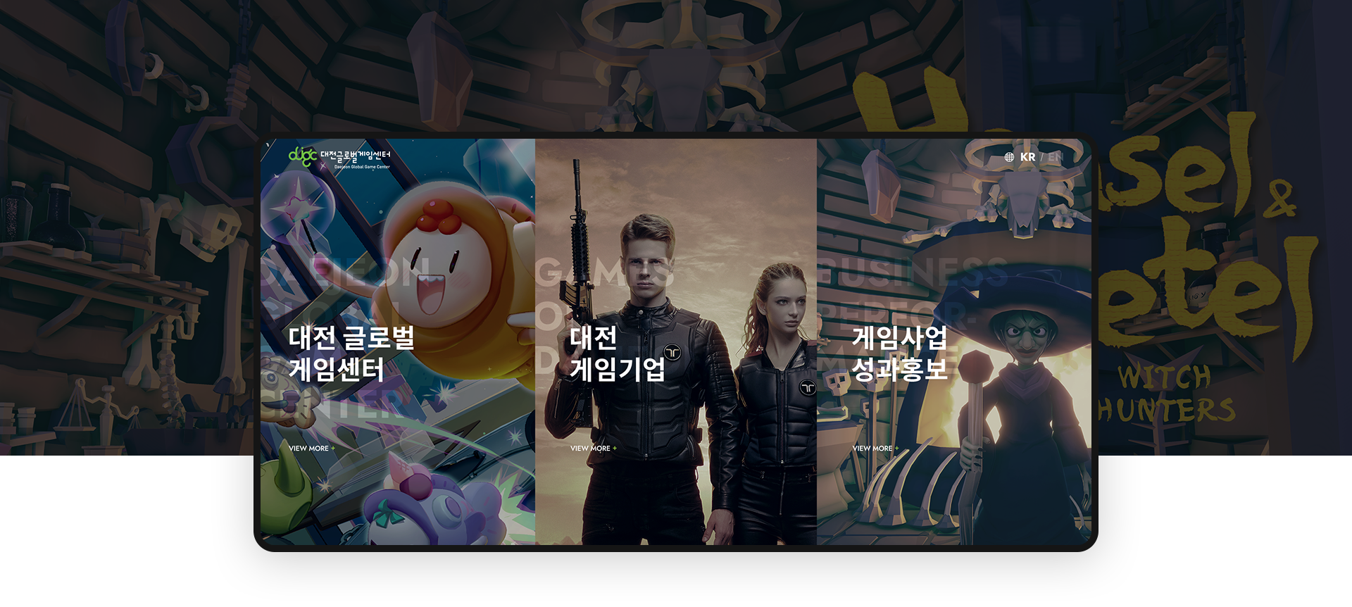 미래 게임시장을 선도할 VR·AR 게임과 시뮬레이터 기반 융복합형 게임 등 경쟁력 있는 차세대 게임을 집중 발굴하고 지원하는 기업의 방향성을 내포했습니다. 메뉴가 분할된 메인화면을 통해 원하는 정보에 쉽게 도달할 수 있는 구조로 사용자가 편리함을 느끼며 시선이 집중되어 컨텐츠에 몰입될 수 있는 레이아웃을 구성하였습니다.